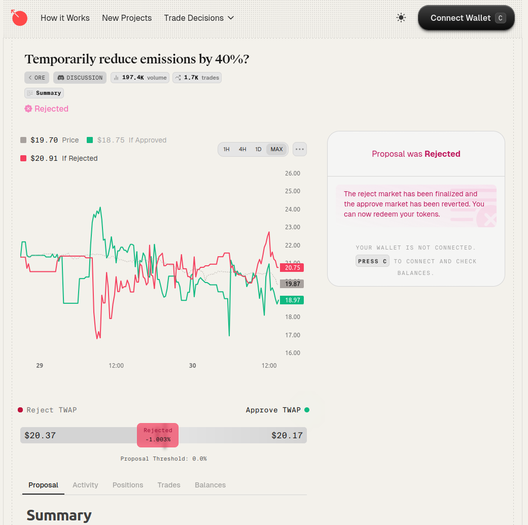 Once a proposal has accumulated enough stake, the project takes half of its liquidity from the spot (e.g. META/USDC) market and moves it into a proposal’s conditional markets. Traders can then make conditional trades over 3 days. Conditional trades are like normal trades, except they revert if the condition isn’t met.Example: Participating in the ORE Market